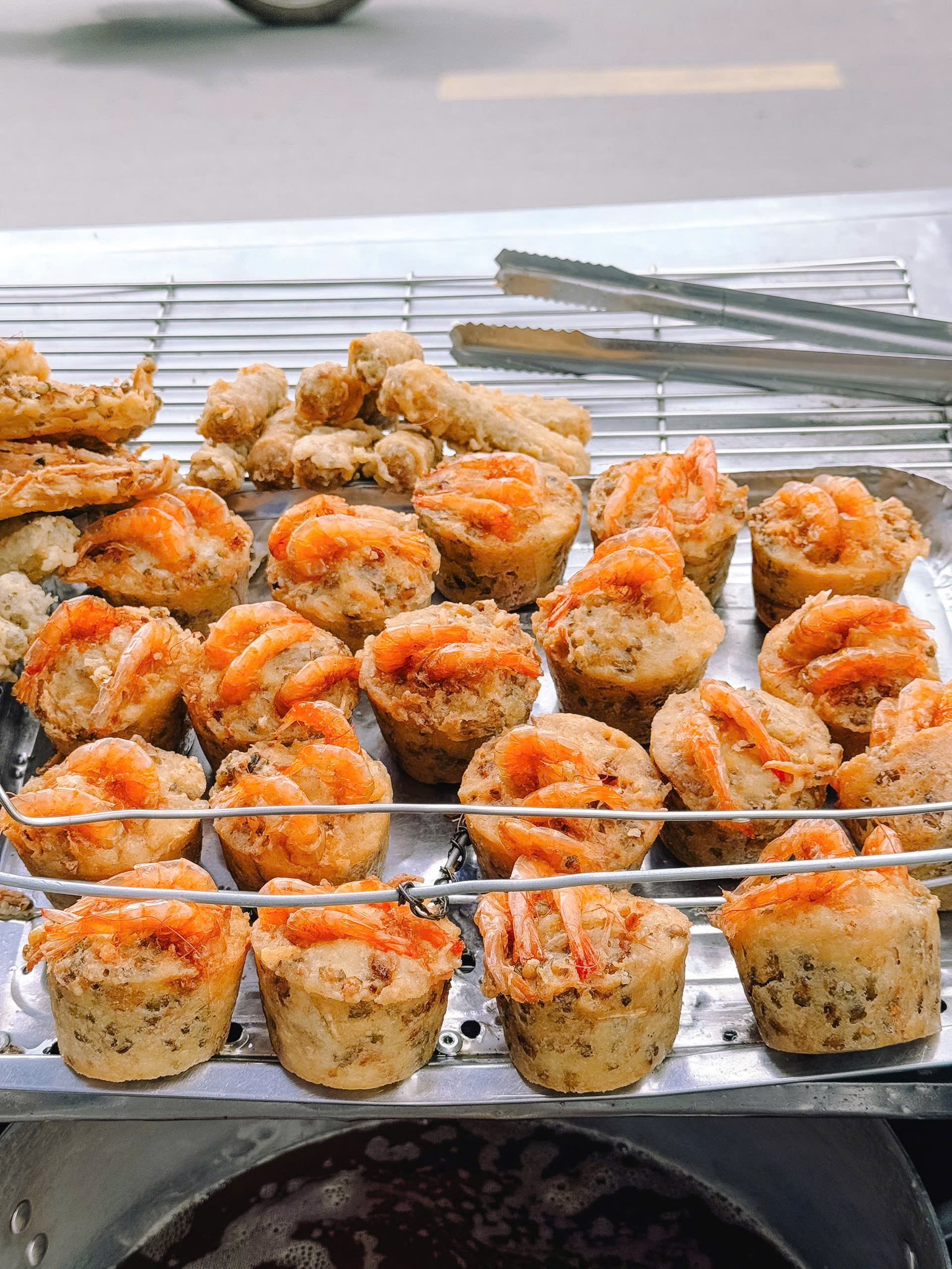 Bánh cống (deep-fried savory cake) from Aunt Nine (176 Nguyen Thi Minh Khai Street, Ninh Kieu Ward, Can Tho City) was a street food spot recommended by a local. The stall is nestled on the sidewalk, with a characteristic Southern Vietnamese street-side atmosphere.