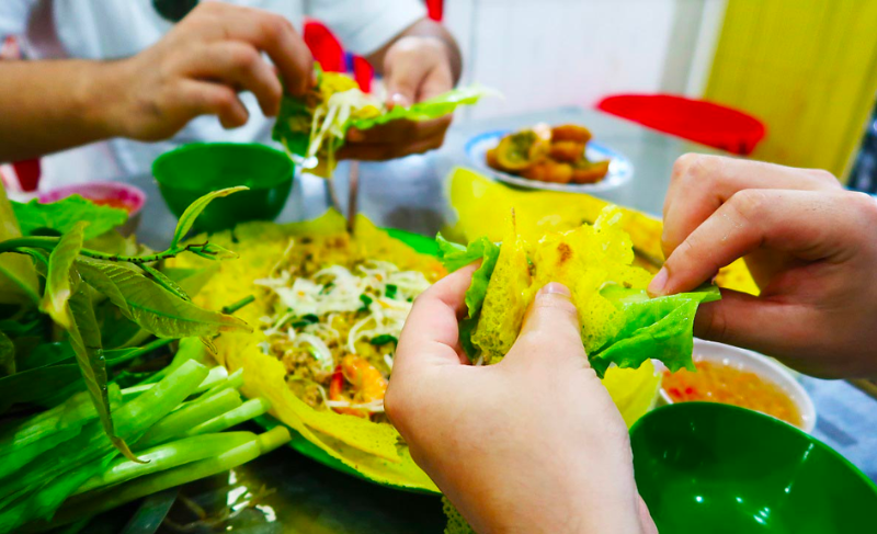 It would be a miss not to eat bánh xèo (sizzling savory crepe) in Can Tho! I went to Bánh Xèo 7 Tới (45 Hoang Quoc Viet Street, Ninh Kieu Ward, Can Tho City). As soon as I walked in, I heard the delightful sizzling sound of batter being poured onto the hot pan.