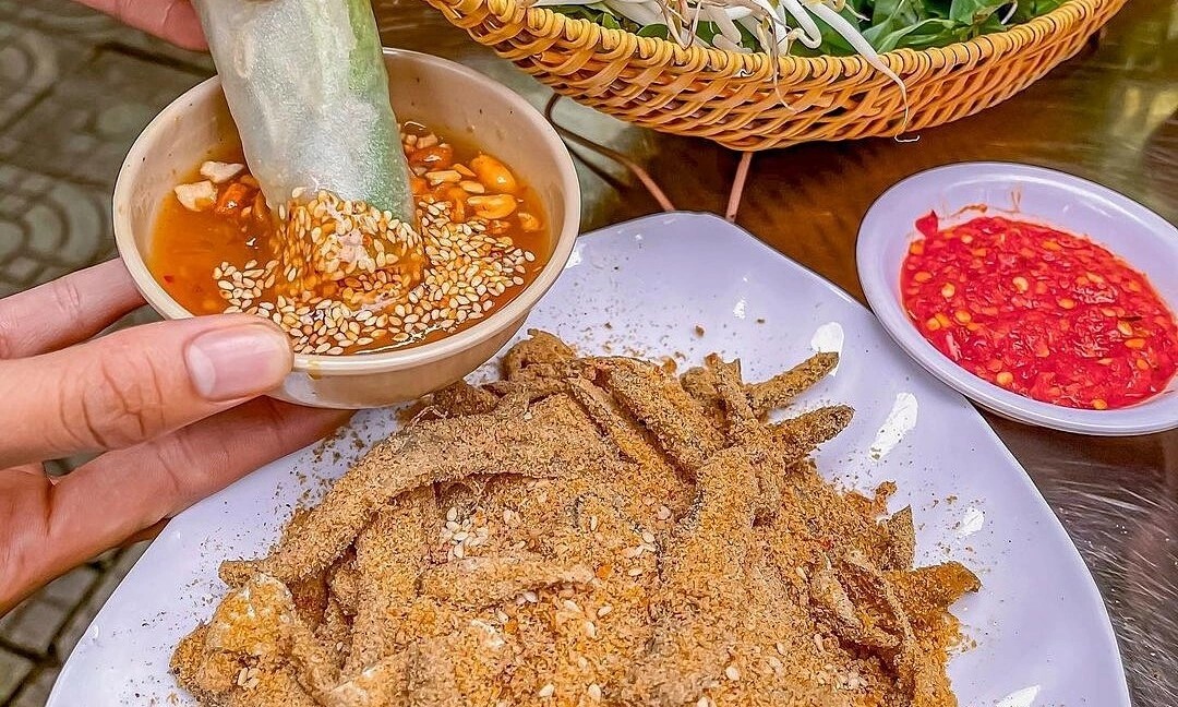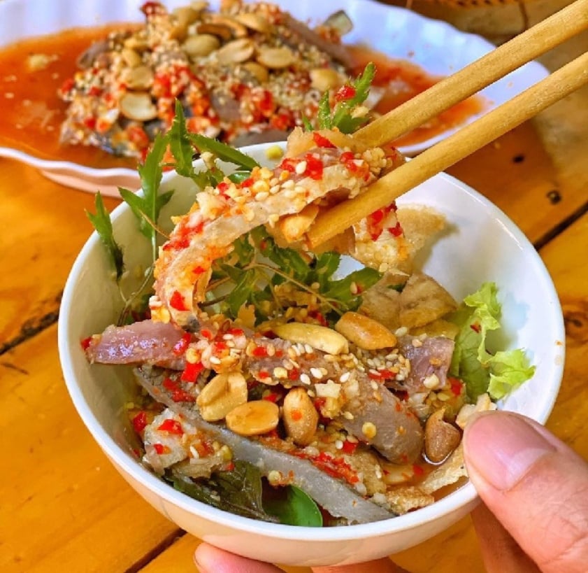 Next, challenge your palate with Nam O fish salad. Aunt Hong restaurant (38 Le Hong Phong, Hai Chau District, Da Nang) is an excellent choice. It may sound a bit exotic, but this dish is truly a symphony of flavors. Thin slices of fresh fish, usually herring, are delicately marinated and mixed with special spices and toasted rice powder. It’s served with various fresh herbs and rice paper. What makes it special is the savory, glossy dipping sauce made from fish bones and a secret blend of spices.